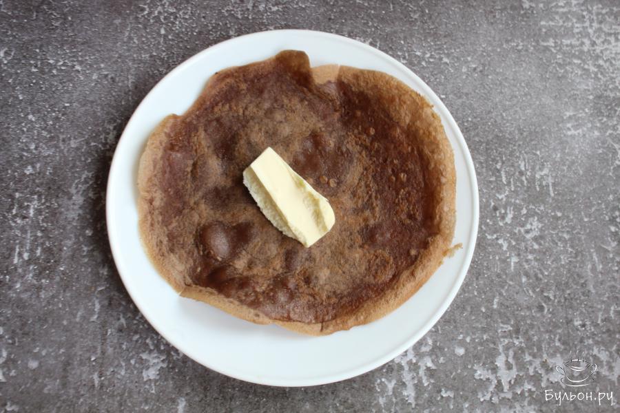 7. Сковороду хорошо разогреть, маслом не смазывать, жарить блинчики с двух сторон, по минуте с каждой стороны. На один блинчик уходит около 1 ст. л. теста. Горячие блинчики смазать маслом.