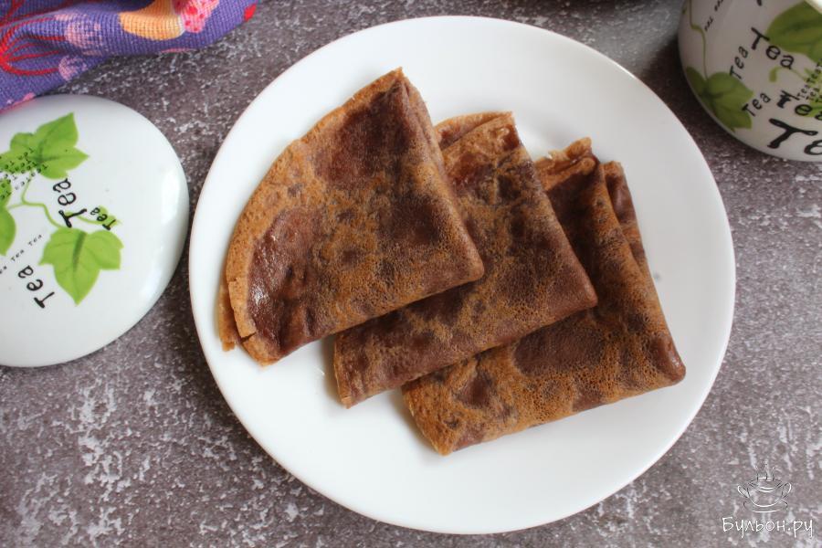 Шоколадные тонкие блинчики с коньяком подойдут для романтического вечера. Так как в тесто добавляется спиртное, то можно считать что, это десерт для взрослых. Алкоголь можно использовать любой, главное, чтобы он имел приятный аромат. По желанию, алкоголь можно не добавлять, а шоколад использовать молочный или простой, тогда блинчики можно предложить людям любого возраста. По этому рецепту блинчики получаются с выраженной горчинкой, ярким ароматом коньяка, они вкусные, необычные, пикантные. Их можно подать со взбитыми сливками, свежими ягодами.