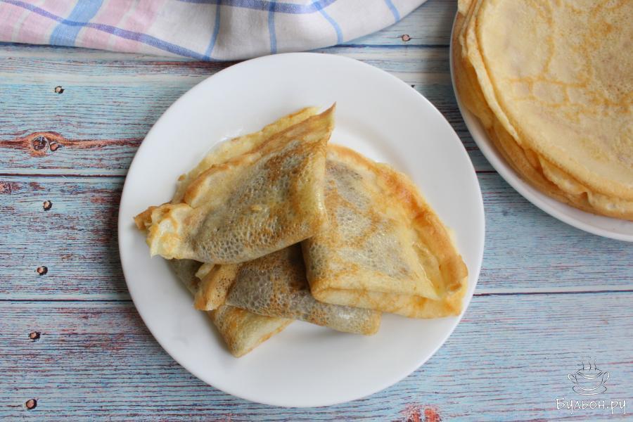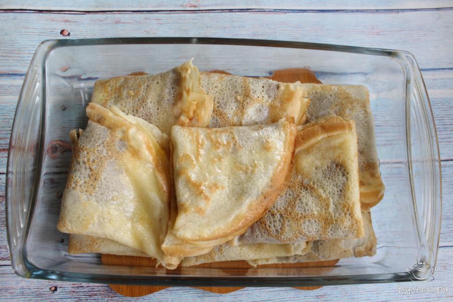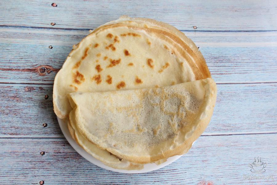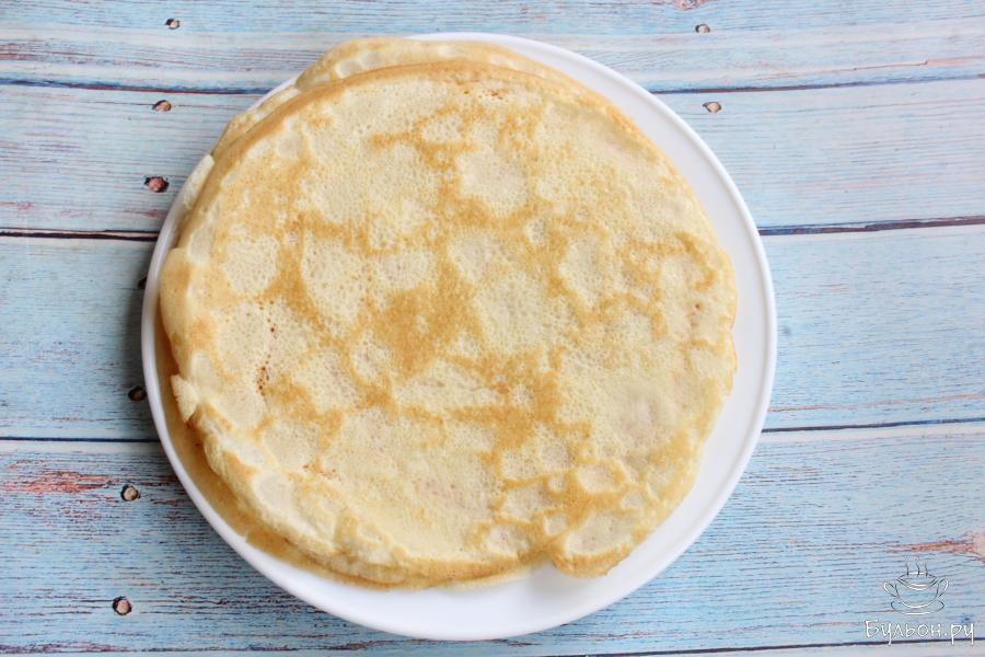 8. Пожарить блинчики на разогретой сухой сковороде, с двух сторон по одной минуте. На один блинчик потребуется около 1 ст. л. теста. Блинчики выложить стопкой в тарелку, маслом не смазывать.