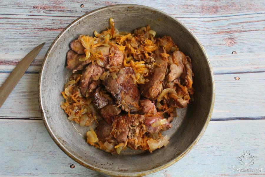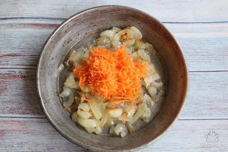 1. Приготовить начинку. Лук и морковь почистить, промыть. Лук нарезать мелко, морковь перетереть через мелкую терку. Жарить овощи на разогретом растительном масле до мягкости.