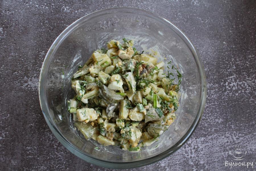 8. Заправить салат майонезом, добавить перец. По желанию можно добавить в салат немного сока или масла из консервов.