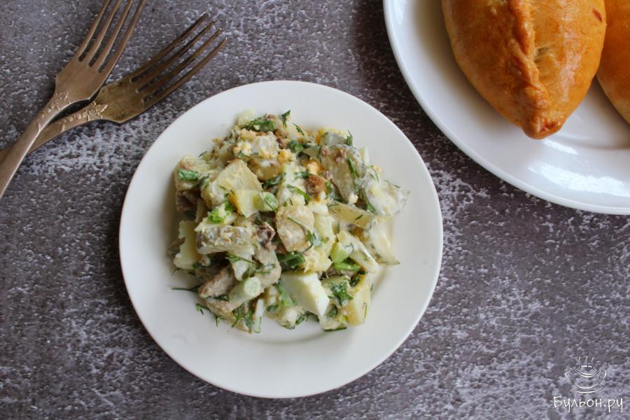 Картофельный салат с рыбными консервами, огурцами и яйцом получается сытный, вкусный, ароматный и нежный. Такой салат можно приготовить с любыми рыбными консервами с маслом или в собственном соку. Салат можно дополнить и другой любимой измельченной зеленью, можно заправить салат сметаной, если вы не употребляете майонез. Попробуйте приготовить такой салат, он наверняка понравится многим. Готовится просто, быстро, из доступных продуктов.