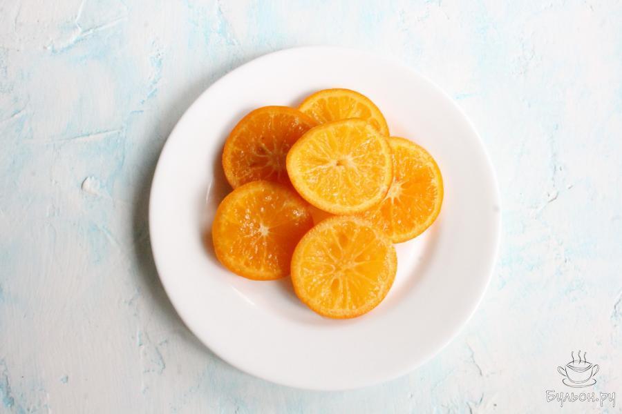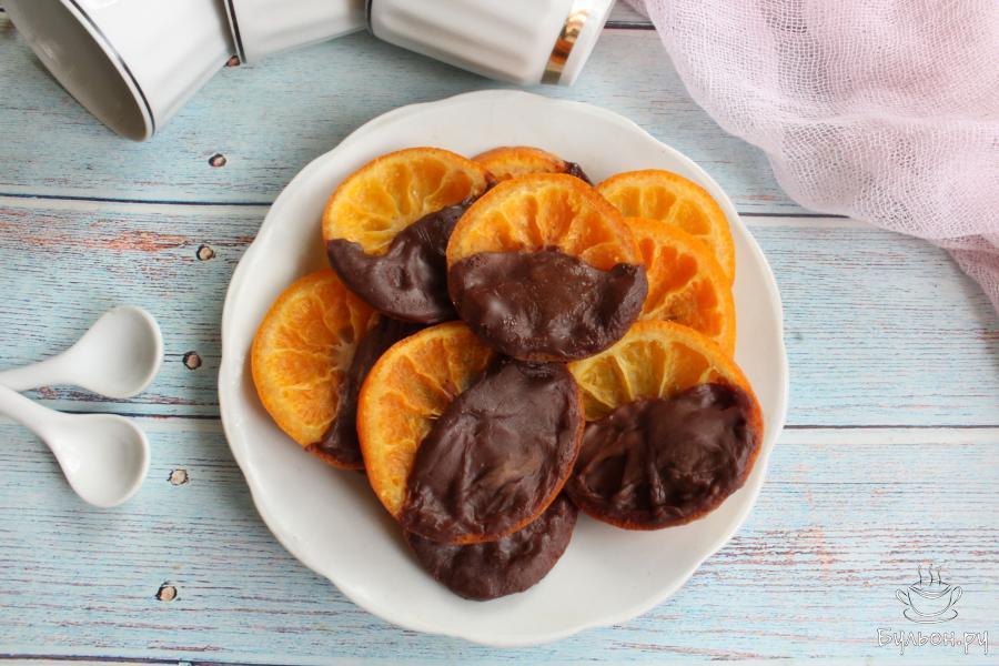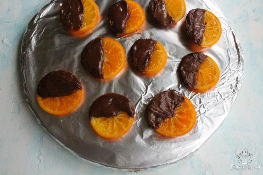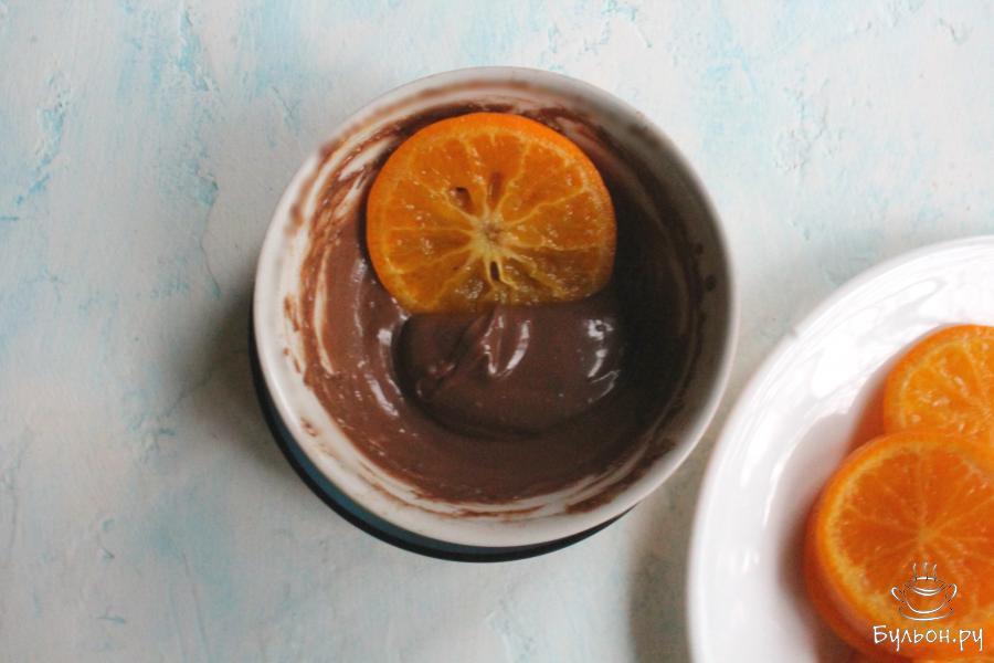 5. Шоколад растопить на водяной бане и обмакивать в него кружочки мандаринов. Шоколад должен покрыть мандариновый кружочек до половины.
