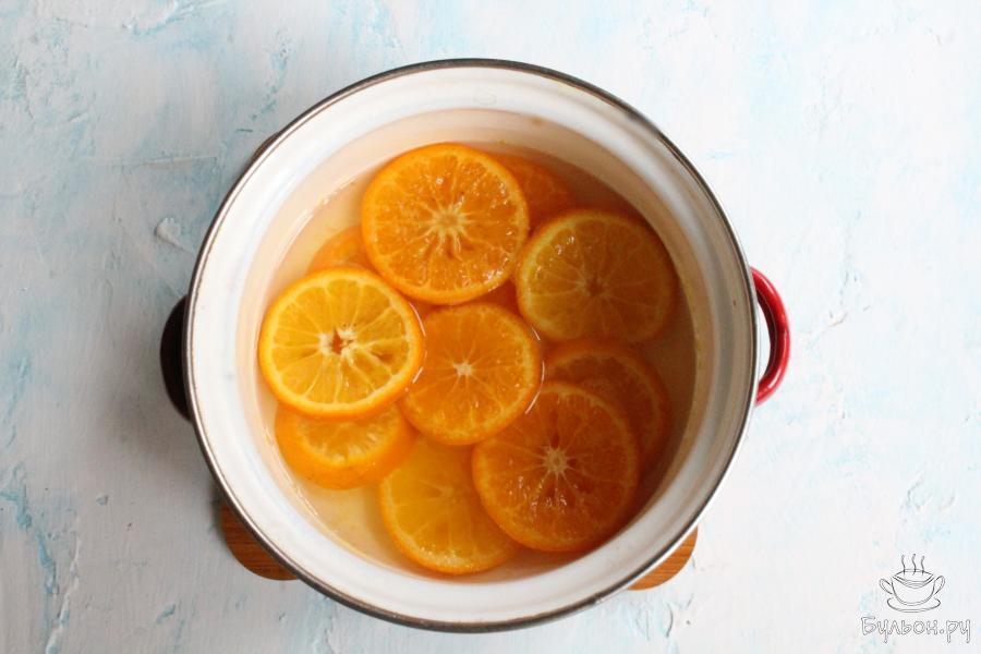 3. Мандарины нарезать кружочками толщиной около 5 мм. Косточки убрать. Выложить кружочки мандаринов в сироп. Варить 15-20 минут на медленном огне.