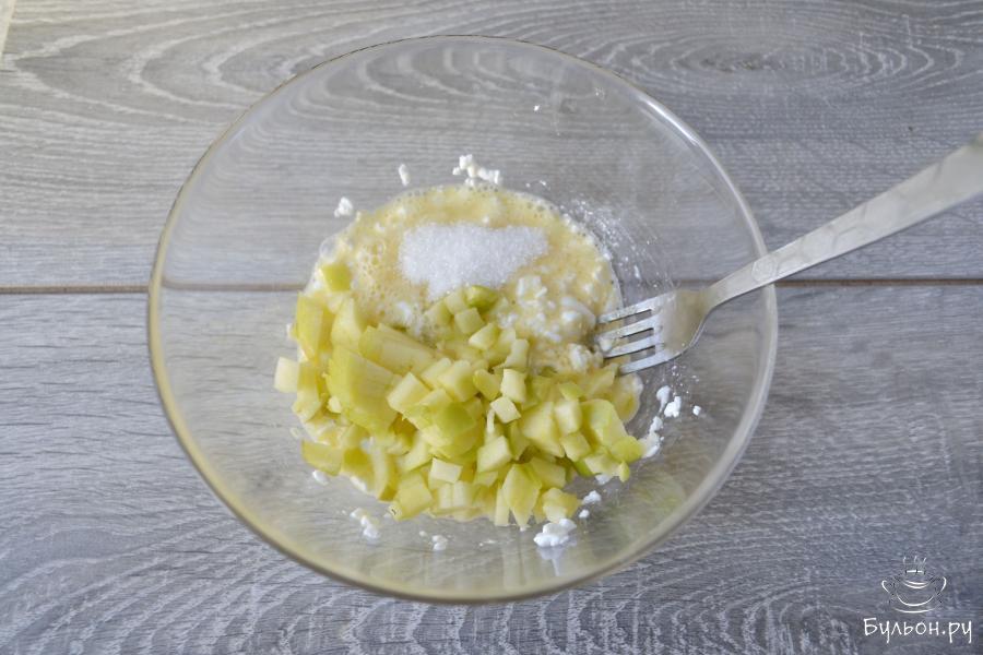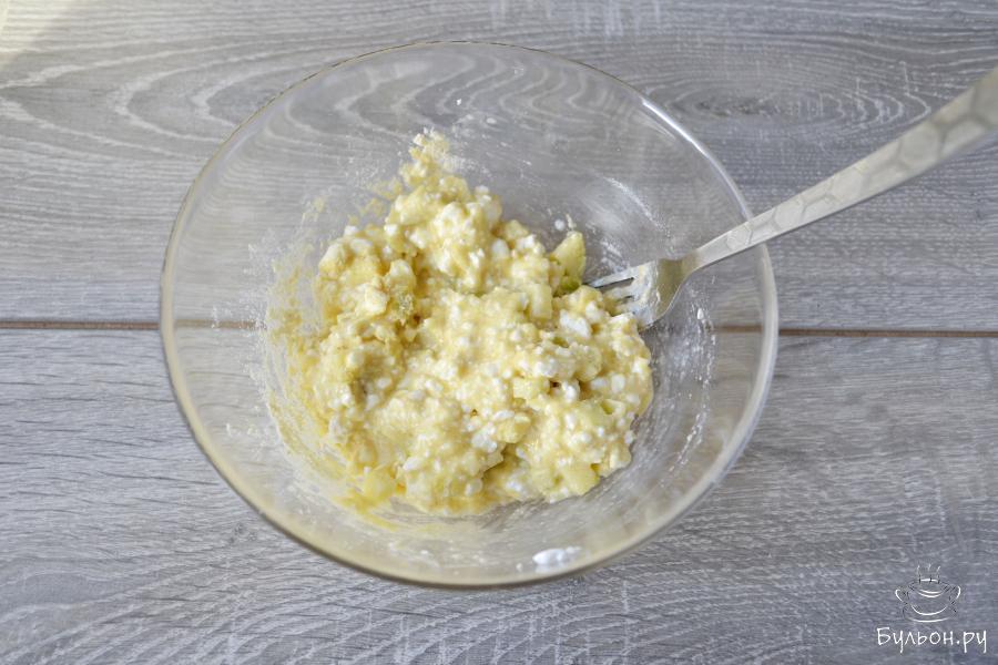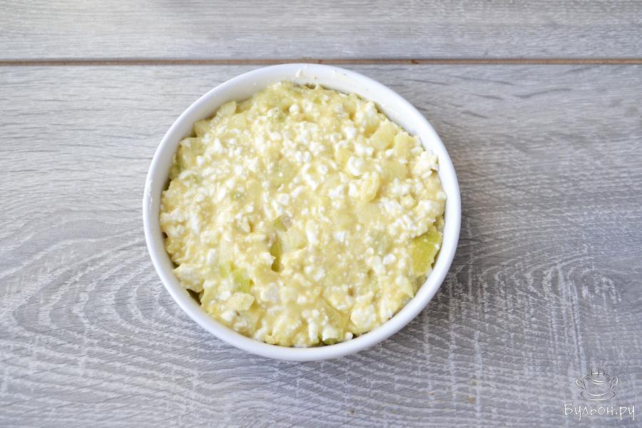 6. Формочку для запекания смазать сливочным маслом и заполнить подготовленной творожно-яблочной массой.