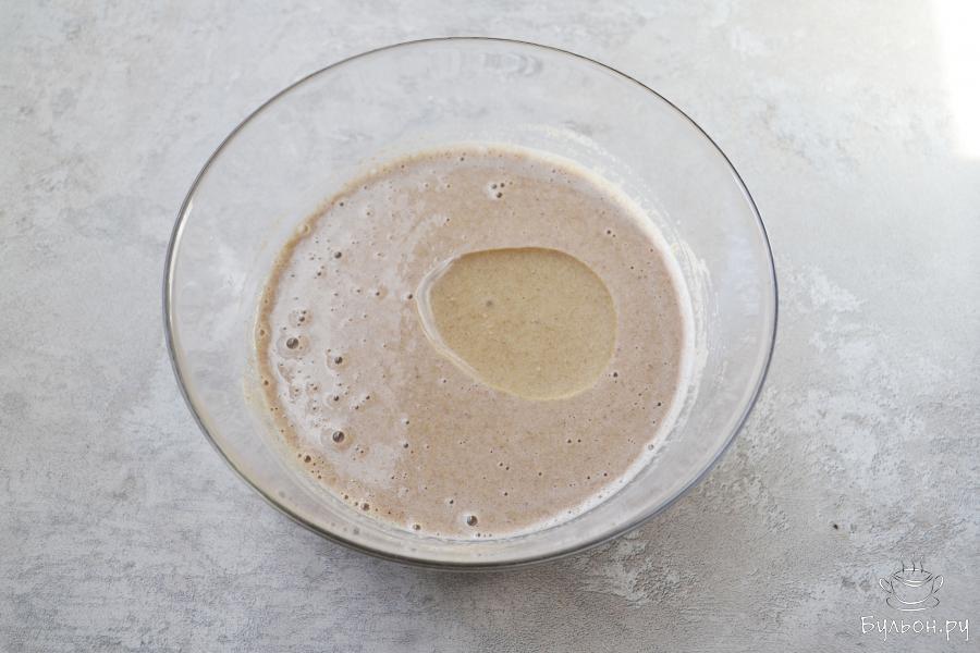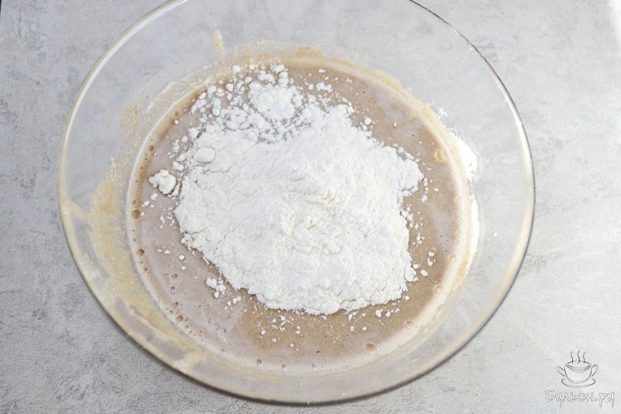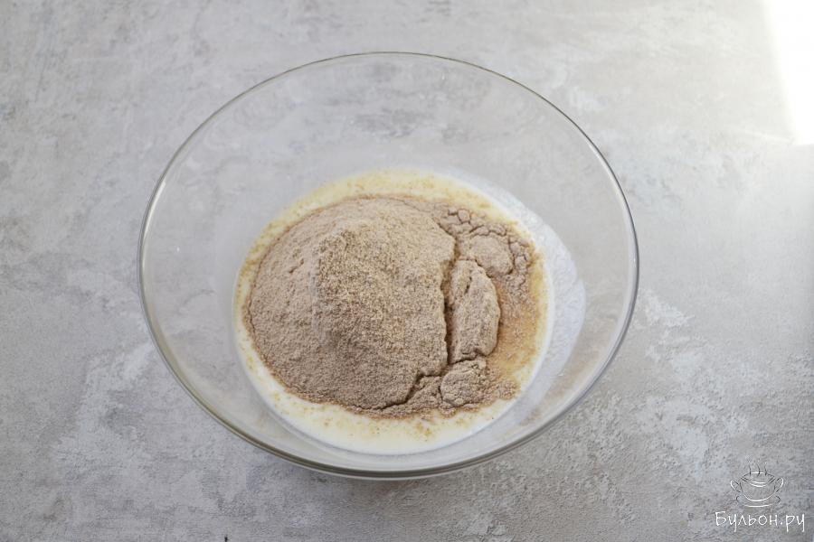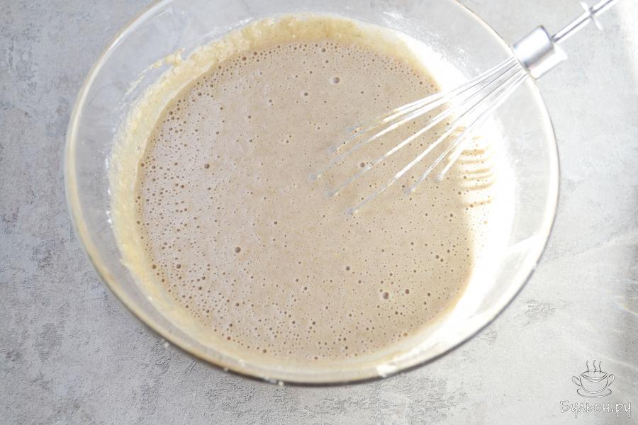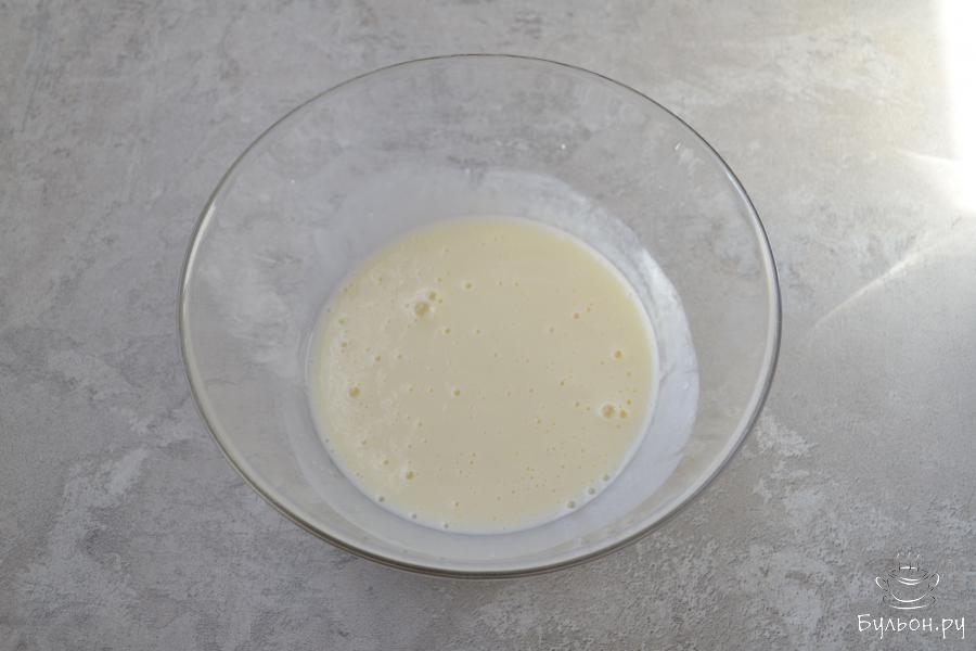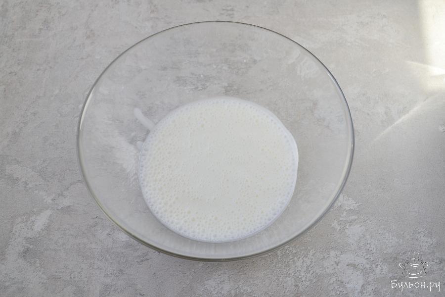 1. Налейте в миску кефир и добавьте соду. Перемешайте, через несколько минут начнется реакция, о чем скажут пузырьки воздуха на поверхности кефира.