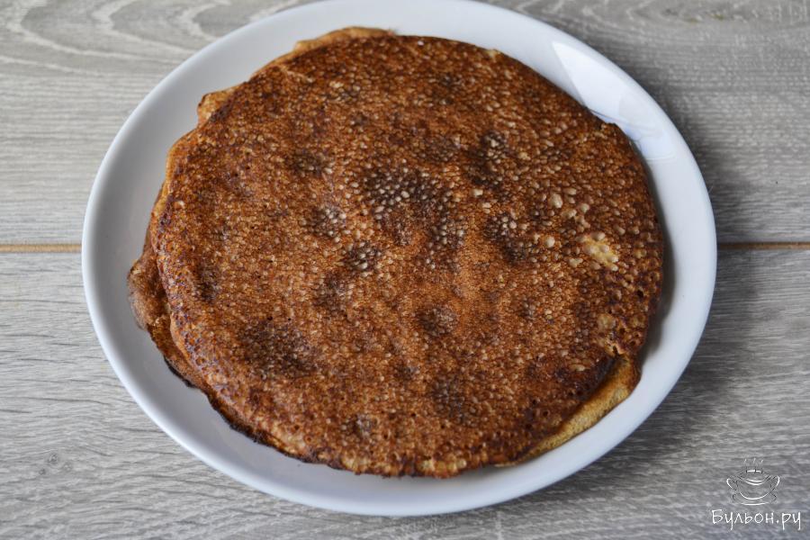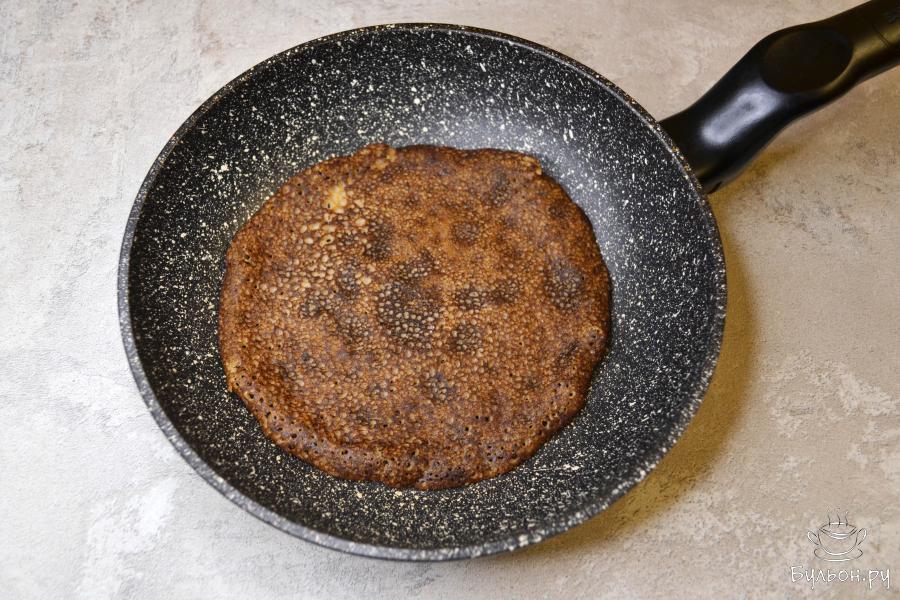 7. Перед выпечкой каждого блина смазывайте сковороду маслом. Выпекайте блины обычном способом, до румяной корочки с обеих сторон. Гречневые блины имеют яркий гречневый вкус и темный цвет по сравнению с блинами из пшеничной муки.