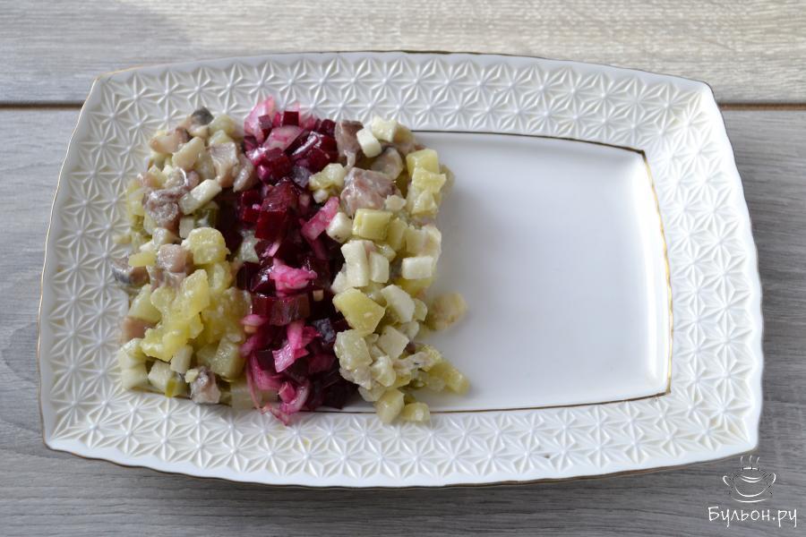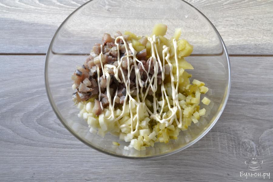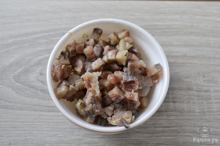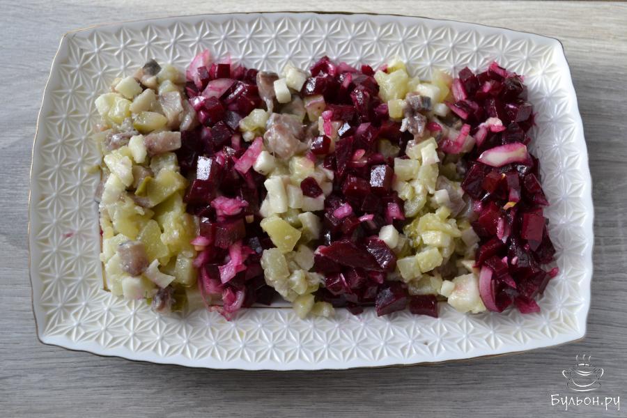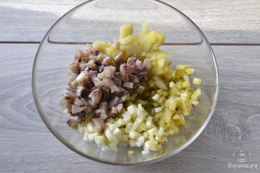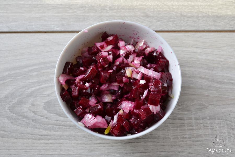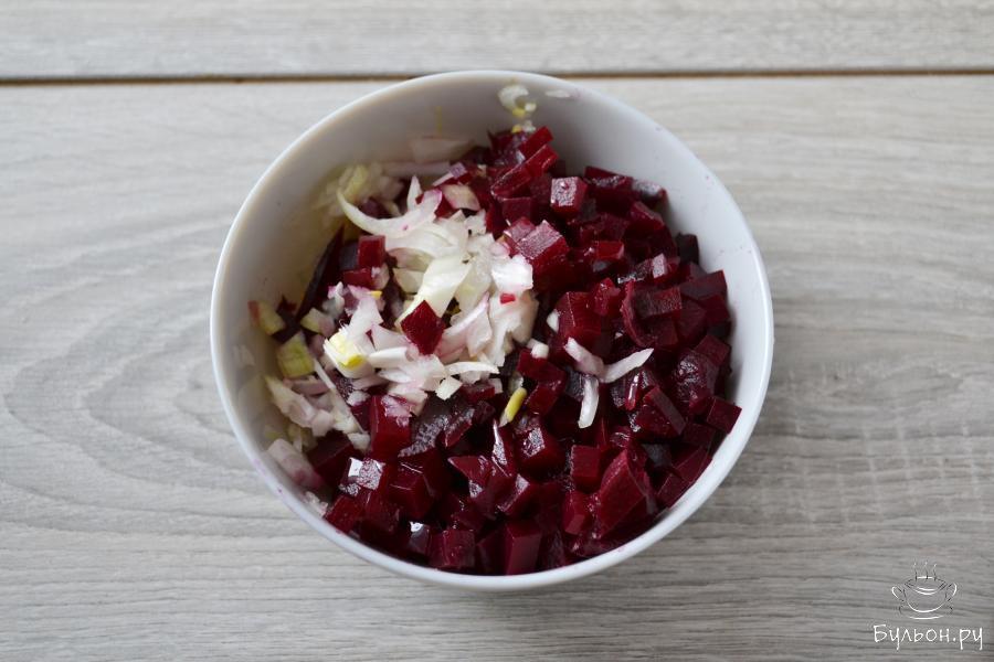 1. Сварите и охладите свеклу и картофель. Свеклу очистите от кожуры и нарежьте мелким кубиком. Соедините свеклу с мелко нарезанным луком.