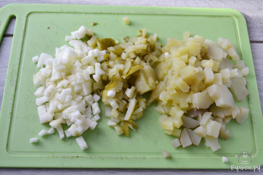 4. Вареный картофель очистите от кожуры и нарежьте мелким кубиком. Также нарежьте маринованный огурец и кисло-сладкое яблоко, заранее удалив семенную камеру.