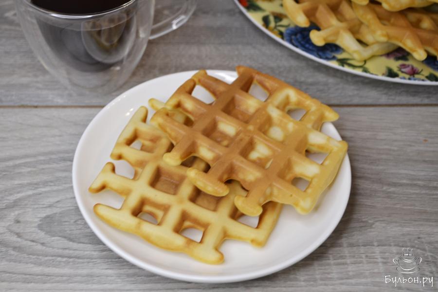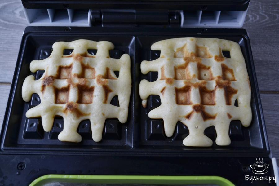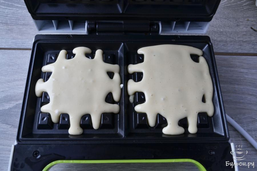 6. Разогреть электровафельницу и вылить примерно по 2 ст. л. теста на одну вафлю. Если нужно, то смазать растительным маслом панели вафельницы перед выпечкой.