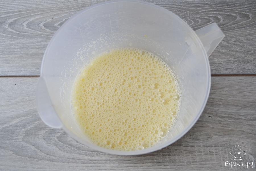 3. Нагреть молоко и растворить в нем сливочное масло. Влить молоко с маслом в яичную смесь и сразу же взбить венчиком.