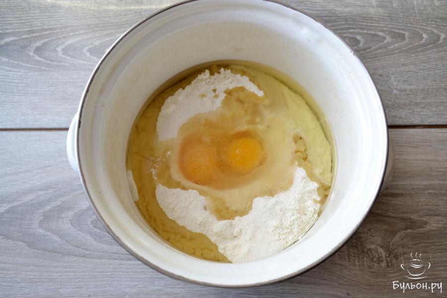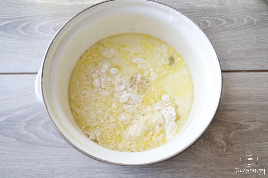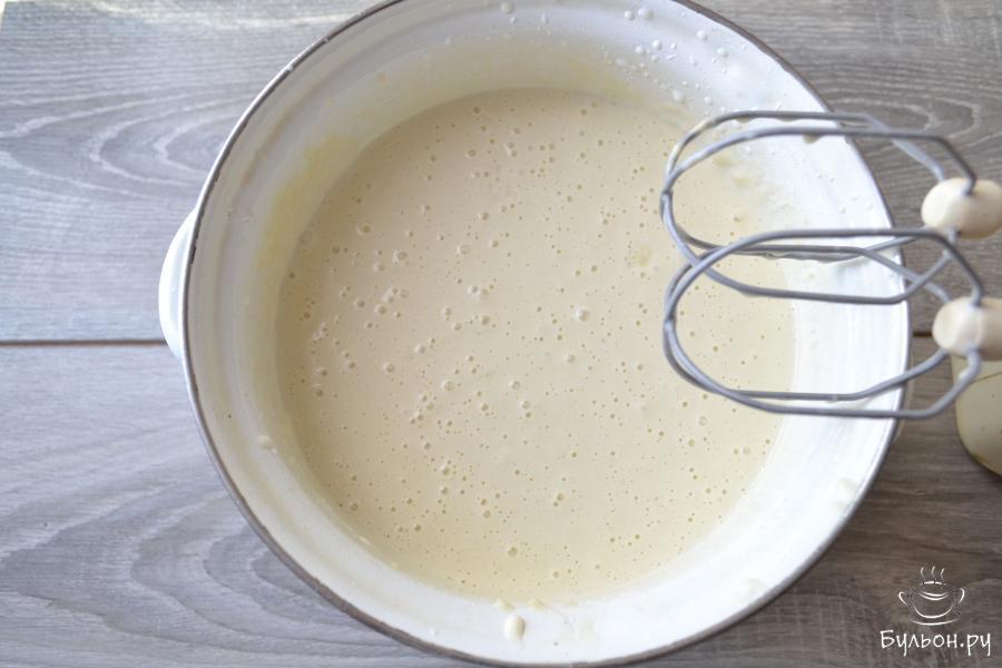 5. Миксером взбейте муку с молоком, чтобы получилось однородное тесто, без комочков. Если необходимо, то влейте еще немного молока, чтобы получилось в меру густое, характерное для блинов тесто. Оставьте кастрюлю с тестом на столе при комнатной температуре на полчаса-час.