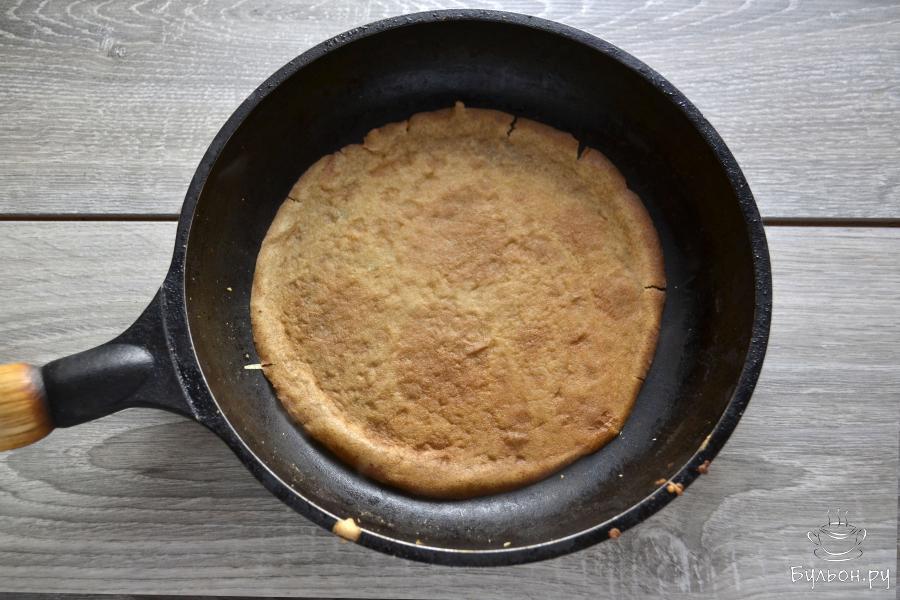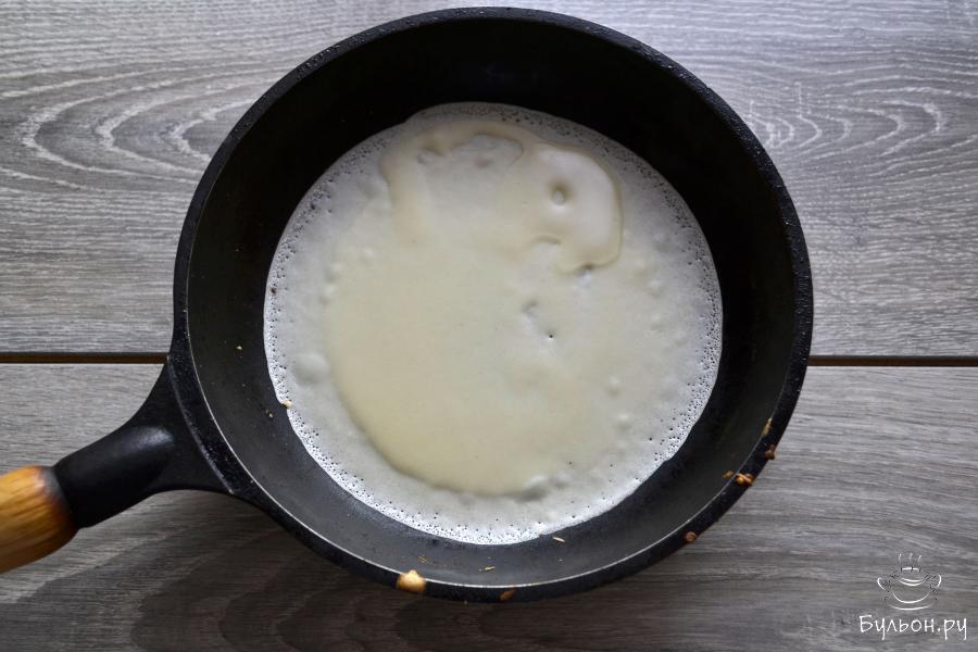 6. Хорошо разогрейте сковороду и вылейте порцию теста. Поворачивая сковороду из стороны в сторону, распределите тесто по всей поверхности сковороды.