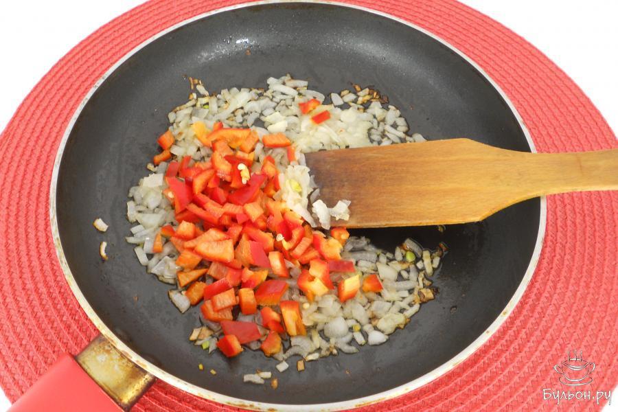 1. Репчатый лук мелко порезать, обжарить на растительном масле до легкой золотистости. Добавить мелко порезанный болгарский перец, обжаривать вместе с луком минуты 3-4.