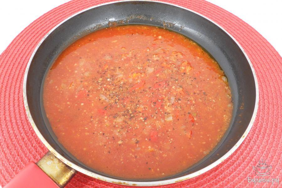 5. Влить томатный сок, добавить прованские травы, перемешать. Также, всыпать соль по вкусу и немного поперчить. Соус прогреть на небольшом огне 3-4 минуты и отставить.