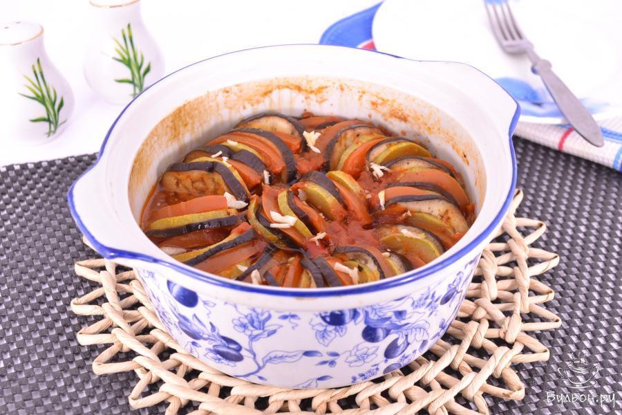9. Накрыть форму фольгой и запекать в духовке при 200 градусах около 40 минут. Готовый рататуй посыпать сверху измельченным чесноком и подать к столу в теплом или охлажденном виде. Приятного аппетита.