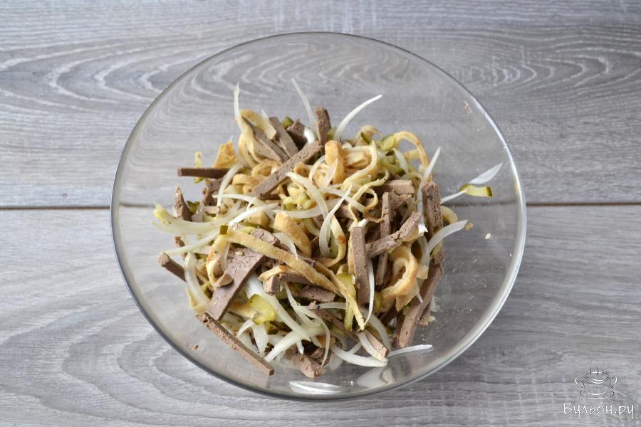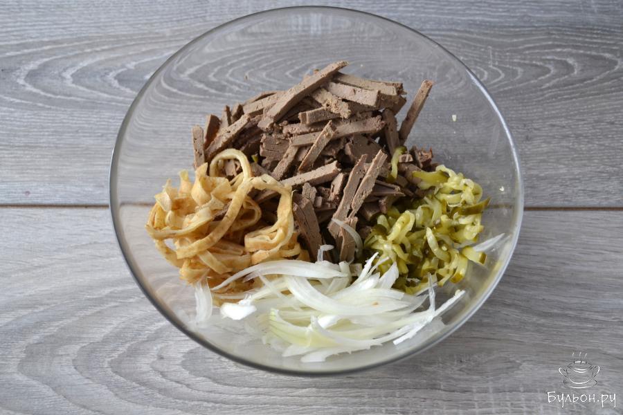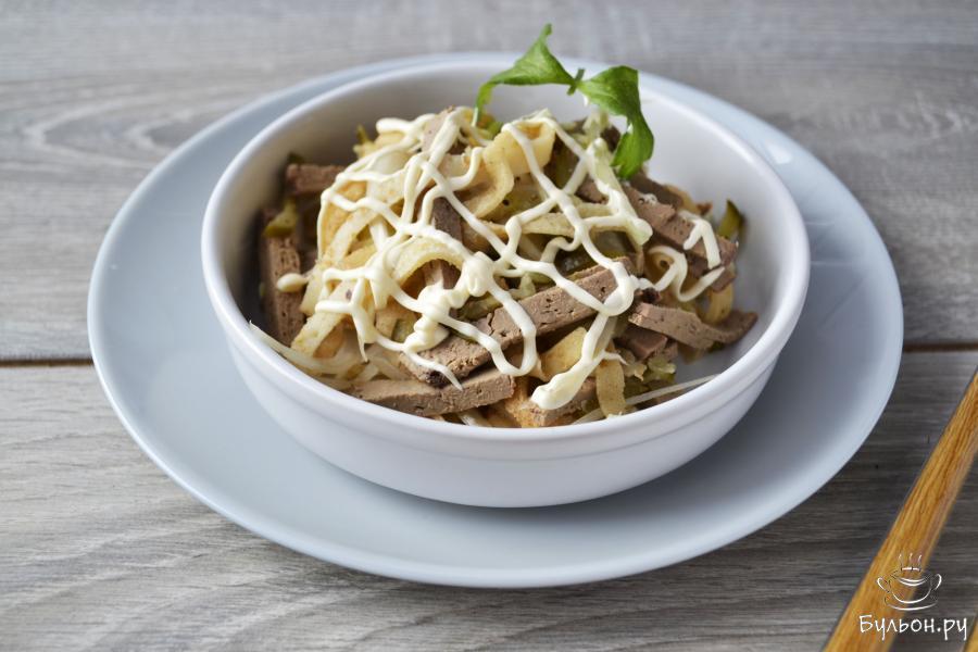 Если вы готовите блюда из субпродуктов, обратите внимание на рецепт салата из говяжьей печени, маринованных огурцов, лука и блинчиков. Салат получается очень сытный и вкусный. Порция салата может быть равна полноценному обеду. Обычные блины, которые используются в салате, можно заменить на яичные блинчики. А, вообще, для салата, можно взять пару блинчиков, которые вы печете для обеда. Нарезать ингредиенты, а заправлять салат майонезом лучше перед самой подачей на стол, чтобы блинчики не размокли и не потеряли свою форму.