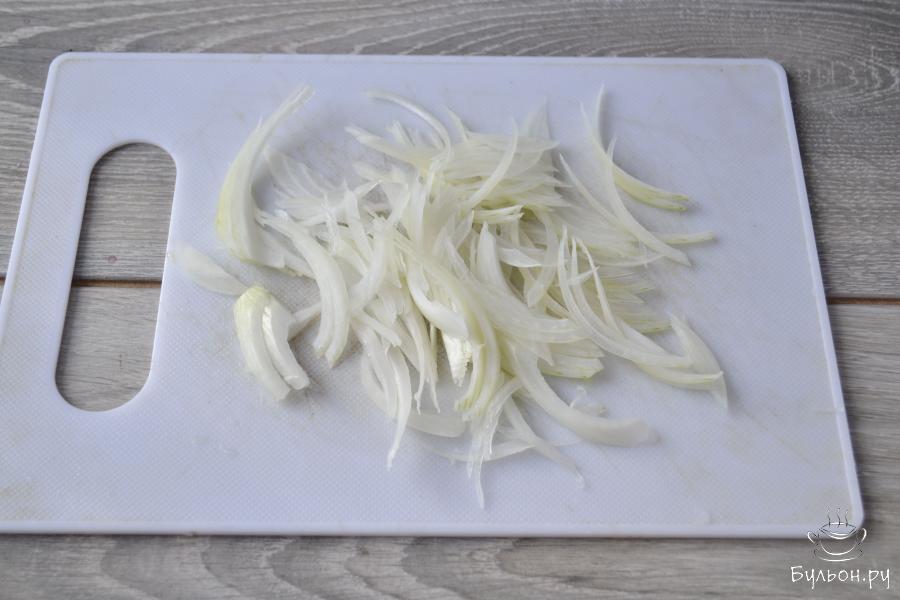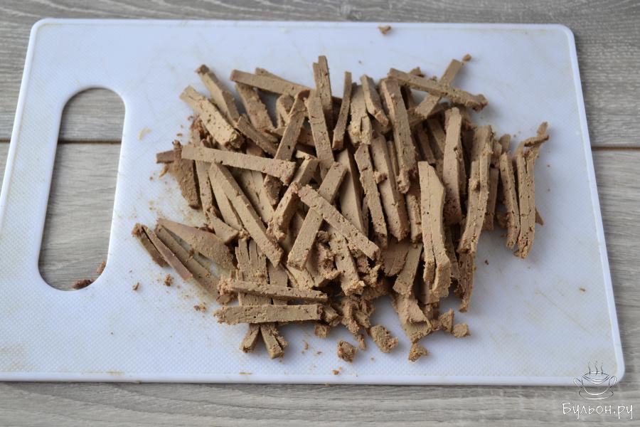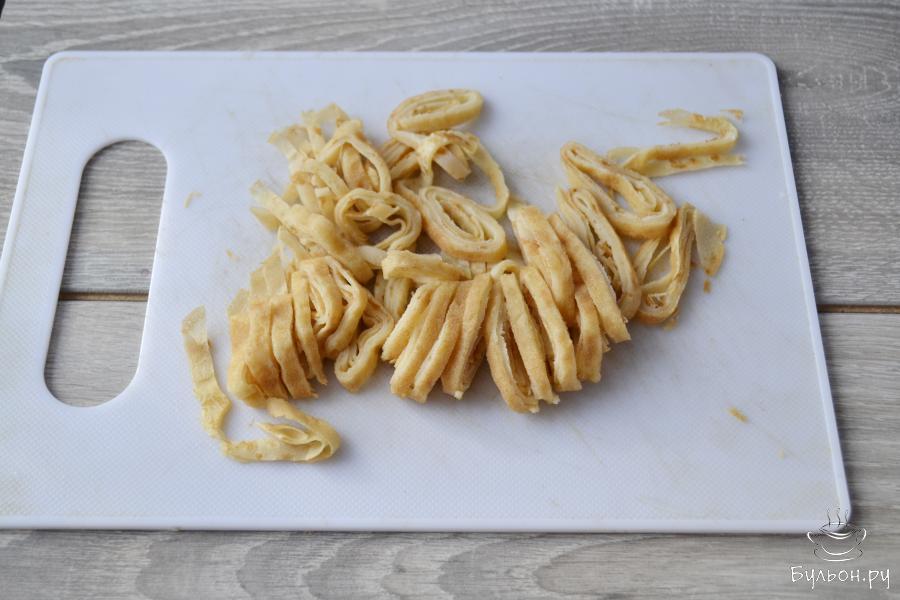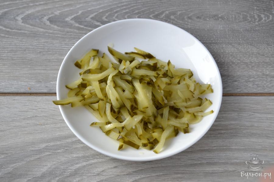 6. Маринованный огурец нарежьте тонкой соломкой и оставьте в блюдечке, чтобы стек рассол. Рассол слейте, огурцы немного отожмите от жидкости.