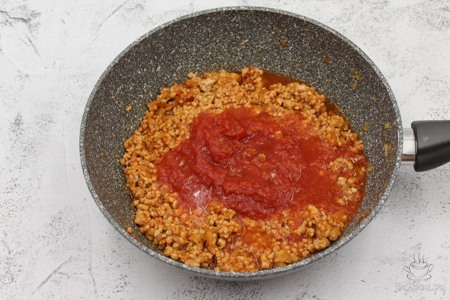 4. Затем влейте измельченные в блендере томаты в собственном соку и добавьте кипяток. Закройте сковороду крышкой и тушите 10 минут.