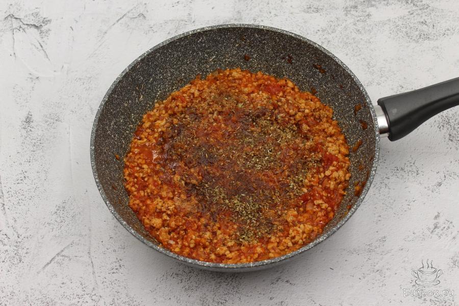 5. На окончательном этапе приготовления, добавьте соль, перец, орегано, перемешайте и снимите сковороду с огня.