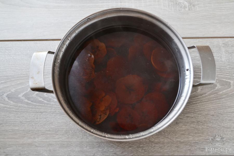 7. Положите сахар по вкусу и долейте воду до нужной концентрации отвара. Поставьте кастрюлю на огонь, доведите компот до кипения, чтобы сахар растворился и снимите с плиты.