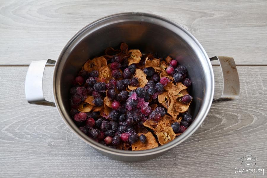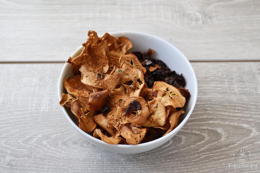 Для приготовления компота можно взять практически любые фрукты, ягоды или сухофрукты. В рецепте я использую сушеные яблоки (50 граммов), вяленую вишню (50 граммов) и замороженную иргу (100 граммов). Сухофрукты у меня свои, домашние, поэтому перед варкой компота я их просто ополоснула водой. Если у вас покупные сухофрукты, то тщательно, меняя воду несколько раз, промойте их. Сахар в компот кладите по вкусу и исходя из сладости сухофруктов.
