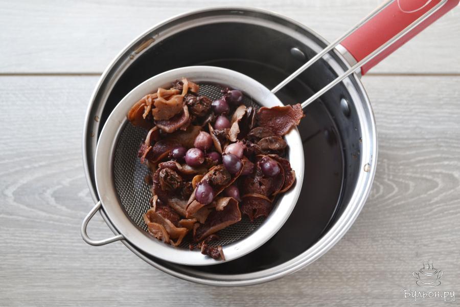 6. Процедите готовый компот через сито. Яблоки и ягоды больше не понадобятся. А если хотите, чтобы в компоте были фрукты, пропустите этот шаг.