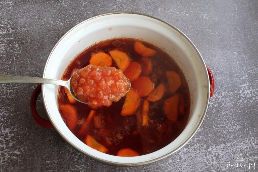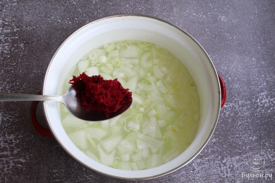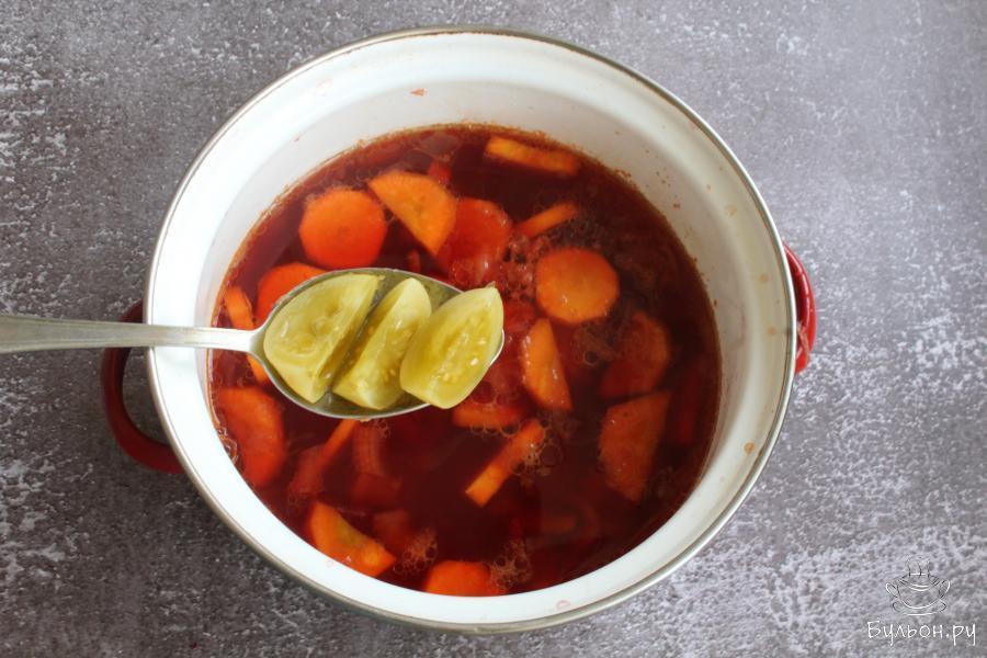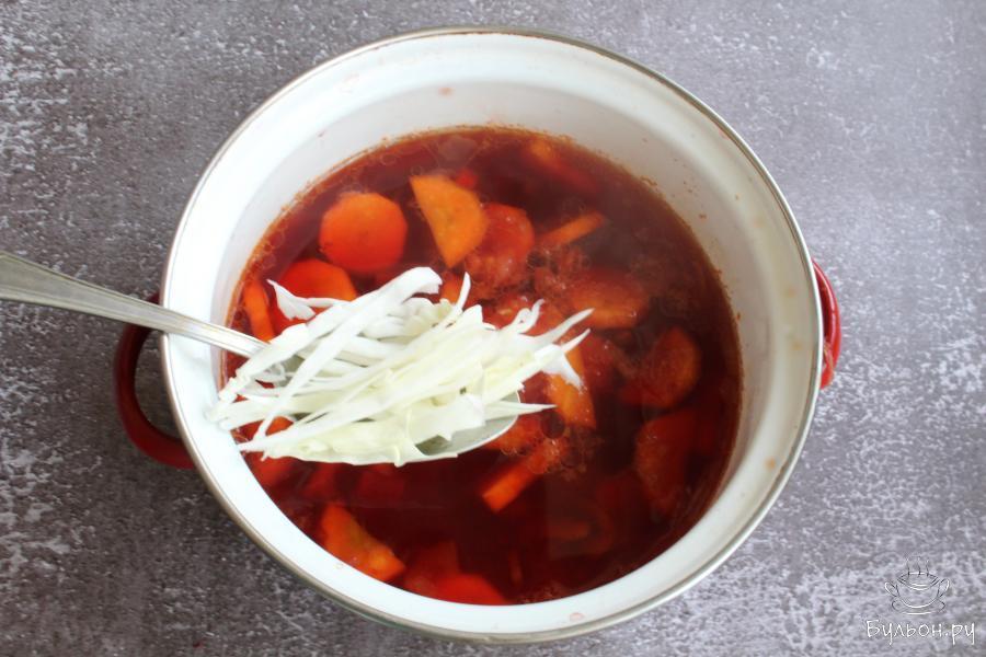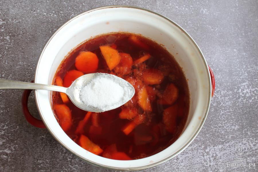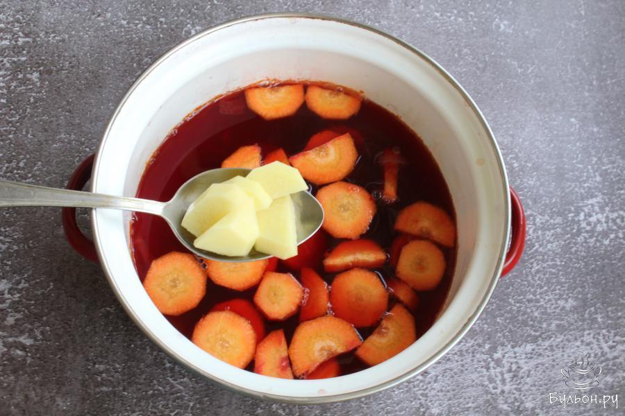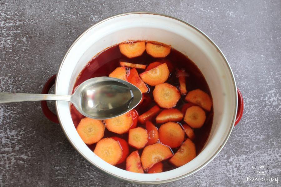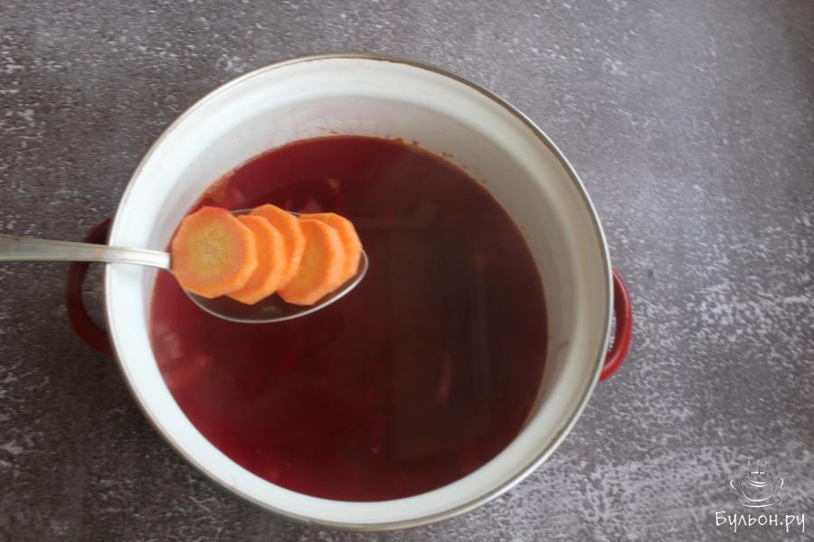 4. Морковь почистить, промыть, нарезать кружочками или полукружочками. Добавить морковь в борщ и варить 10 минут.