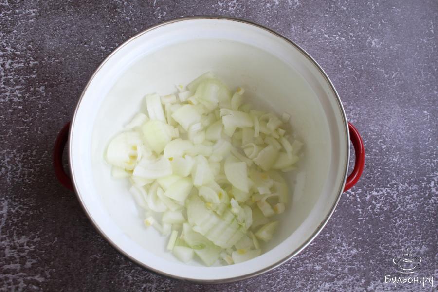 1. Лук почистить, промыть, мелко нарезать, выложить в кастрюльку, залить лук водой и поставить вариться. Варить 3-4 минуты.