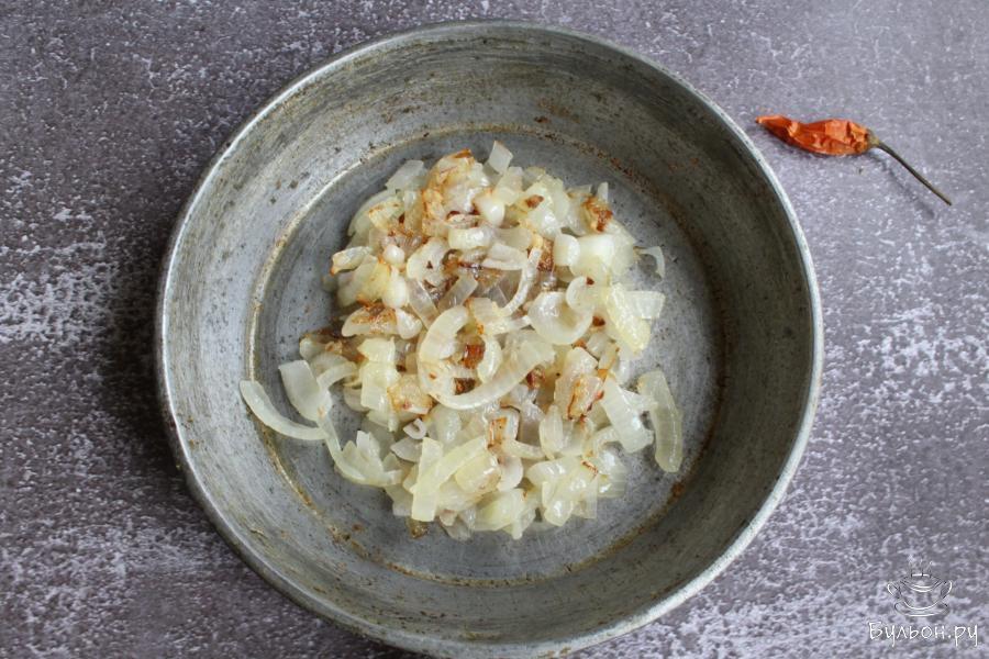 3. Лук почистить, промыть и мелко нарезать. Обжарить лук до мягкости на сковороде с 0.5 ч. л. растительного масла.