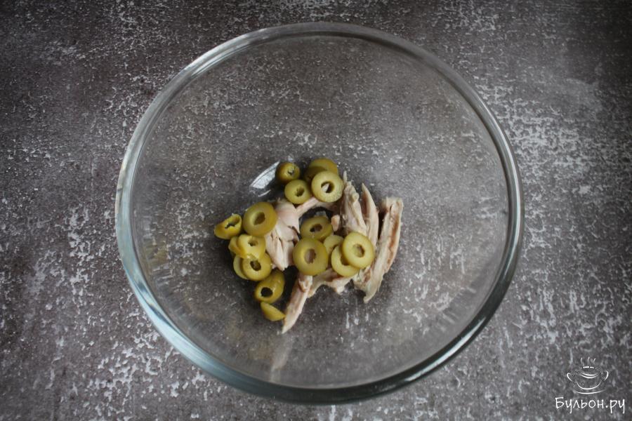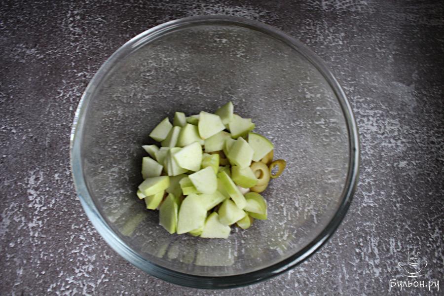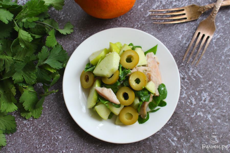 Яркий и легкий салат с курицей, яблоками и оливками хорош, как для разгрузочных дней, так и для повседневного меню. Он пикантный, сочный, вкусный, полезный и аппетитный. Для приготовления подойдет мясо с любой части куриной тушки. Яблоки желательно взять кислых сортов, а оливки развесные зеленые в сильно кисло-соленом маринаде, тогда салат будет просто взрыв вкусов. Салат готовится очень просто, он порадует вас и своим весенним видом, и необычным вкусом.
