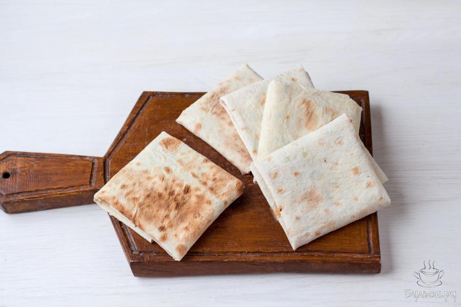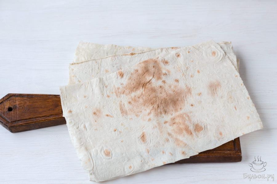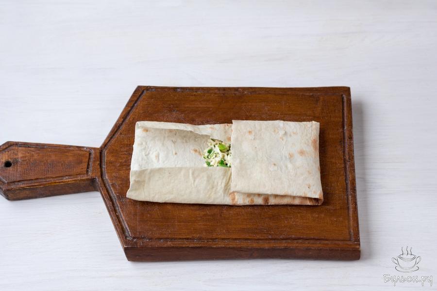 5. Сверните правую сторону листа лаваша по направлению к центру. Затем, таким же образом, сложите лист лаваша с левой стороны.