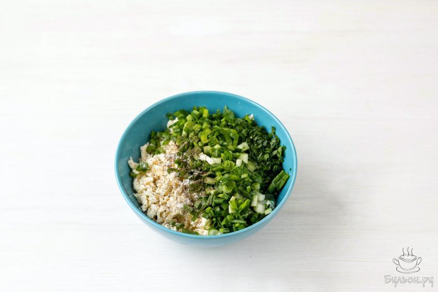 2. Соедините компоненты начинки: натертый сыр, мелко нарезанный зеленый лук и петрушку. Добавьте по вкусу немного соли и молотого черного перца. Тщательно все перемешайте.