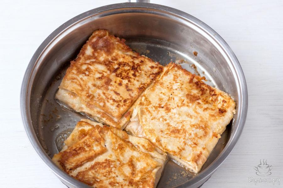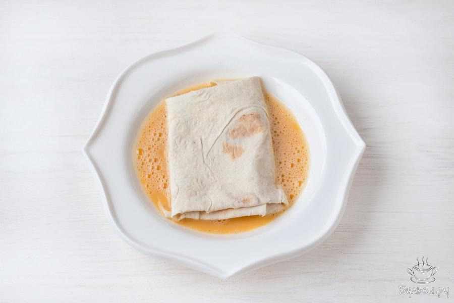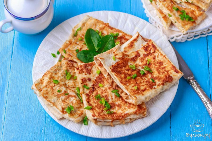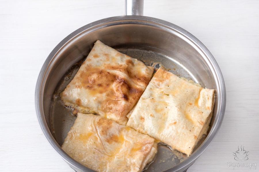 11. Обжаривайте конверты из лаваша 3-4 минуты, с одной стороны, а затем переверните и обжаривайте еще 3-4 минуты, с другой стороны. За несколько минут до окончания приготовления, сковороду можно прикрыть крышкой, для того что бы начинка лучше прогрелась и сыр расплавился.