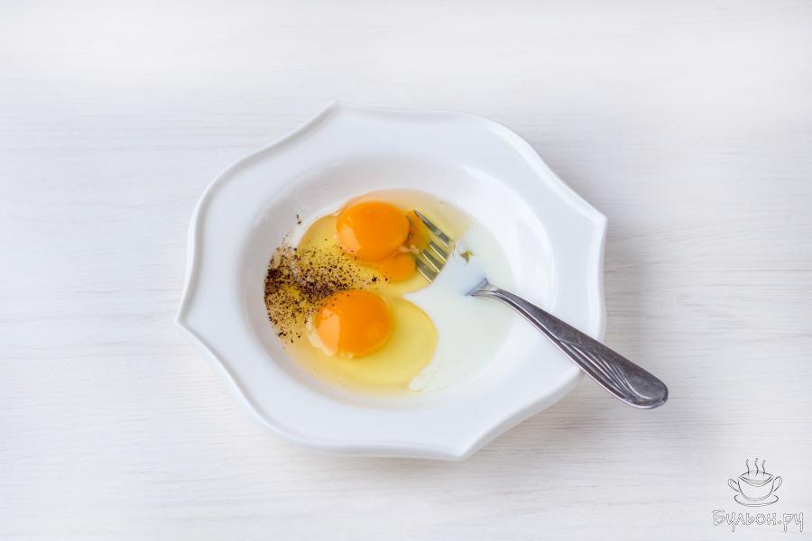7. В отдельной емкости соедините 2 куриных яйца и 1-2 столовые ложки воды или молока. Добавьте щепотку соли и молотого черного перца, а затем взбейте смесь вилкой несколько минут до получения однородной массы.
