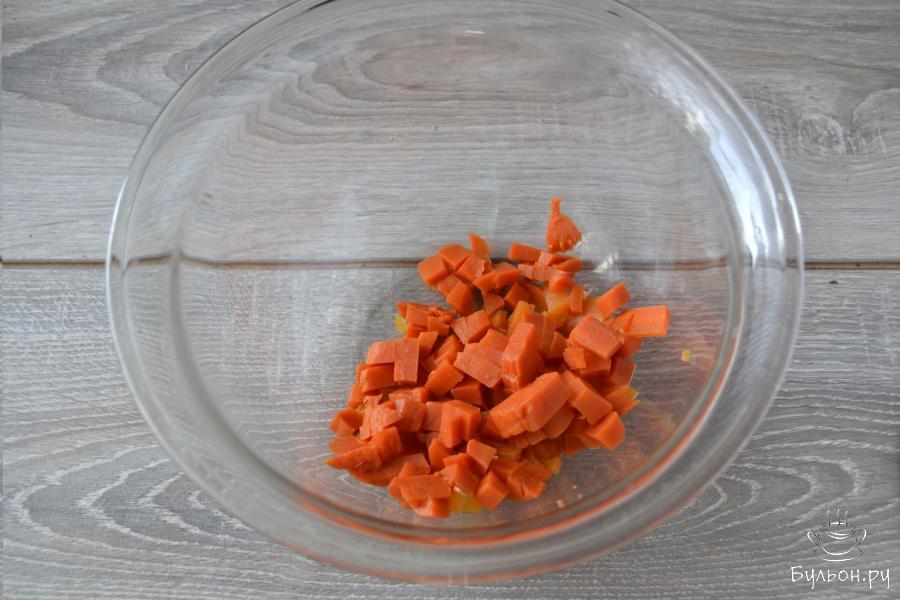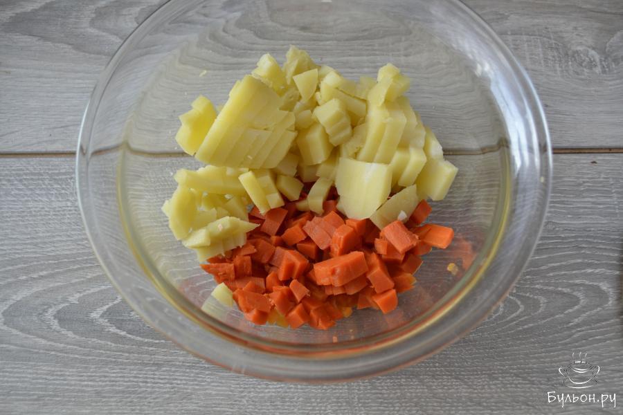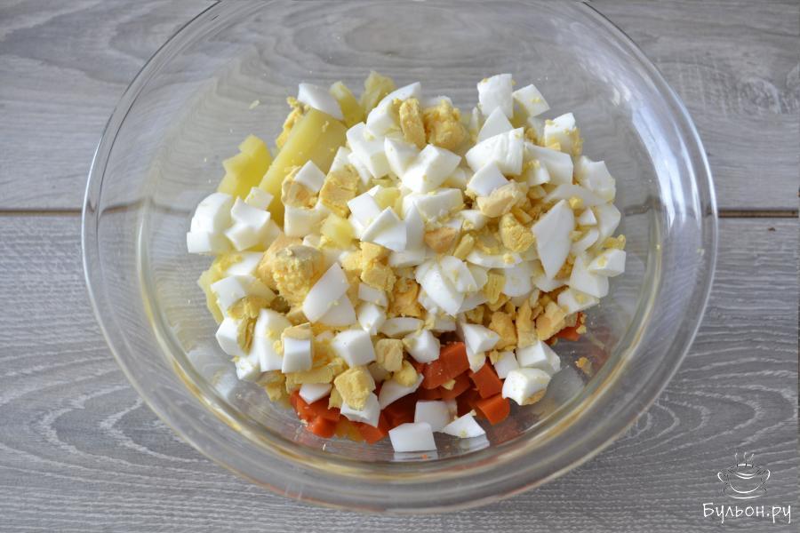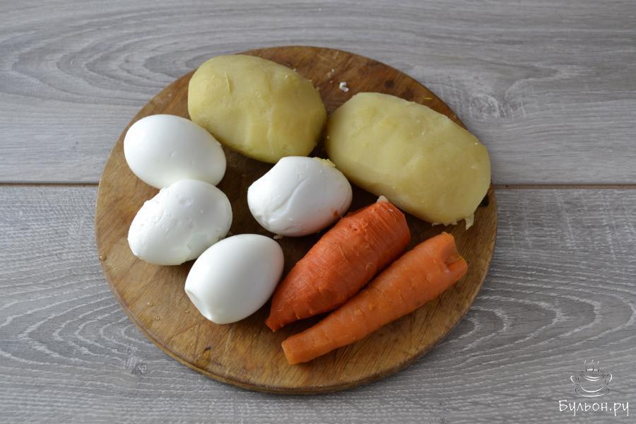 1. Сварите морковь и картофель в "мундире", охладите и очистите. Яйца сварите вкрутую, залейте холодной водой и очистите.