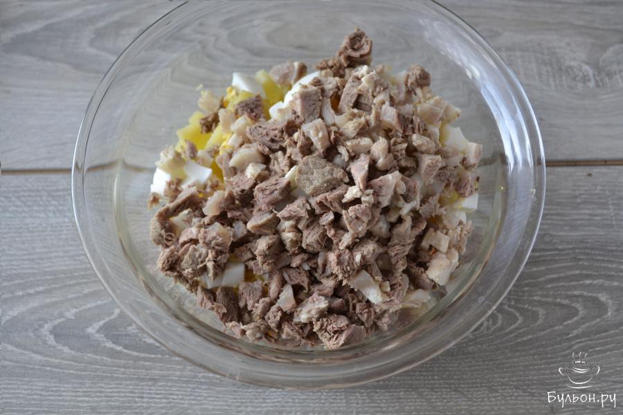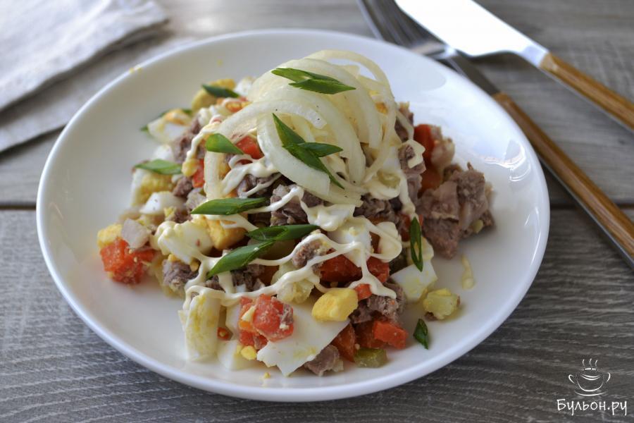 Предлагаю рецепт очень простого в приготовлении салата, в составе которого вареные картофель, морковь, яйца, говядина, а также маринованные огурцы. Перед нарезкой салата все вареные продукты охладите до комнатной температуры. Салат будет аппетитнее смотреться, если все ингредиенты нарезать одинаковыми по размеру, мелкими кубиками. Репчатый лук нужно замариновать с применением яблочного уксуса. Маринованный лук придает особую пикантность салату. Он не такой острый и жгучий. Салат получается очень сытный, порция может заменить полноценный обед. Салат можно сдобрить майонезом или сметаной.