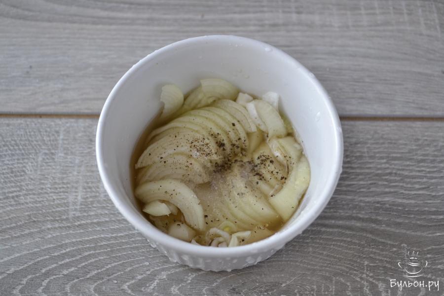 2. Пока варятся овощи и мясо, очищенный репчатый лук нарежьте полукольцами или перьями, сложите в небольшую мисочку. Залейте лук яблочным уксусом пополам с водой, посыпьте черным молотым перцем, добавьте по щепотке соли и сахара. Оставьте лук мариноваться на 20-30 минут.
