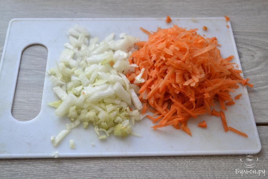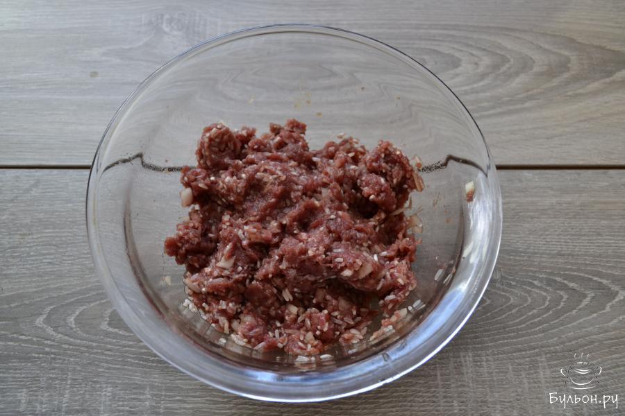 1. Положить в глубокую миску фарш, промытый сырой рис, мелко порезанную одну луковицу, посолить, разбить яйцо.