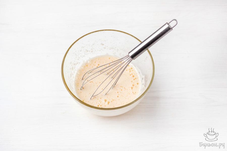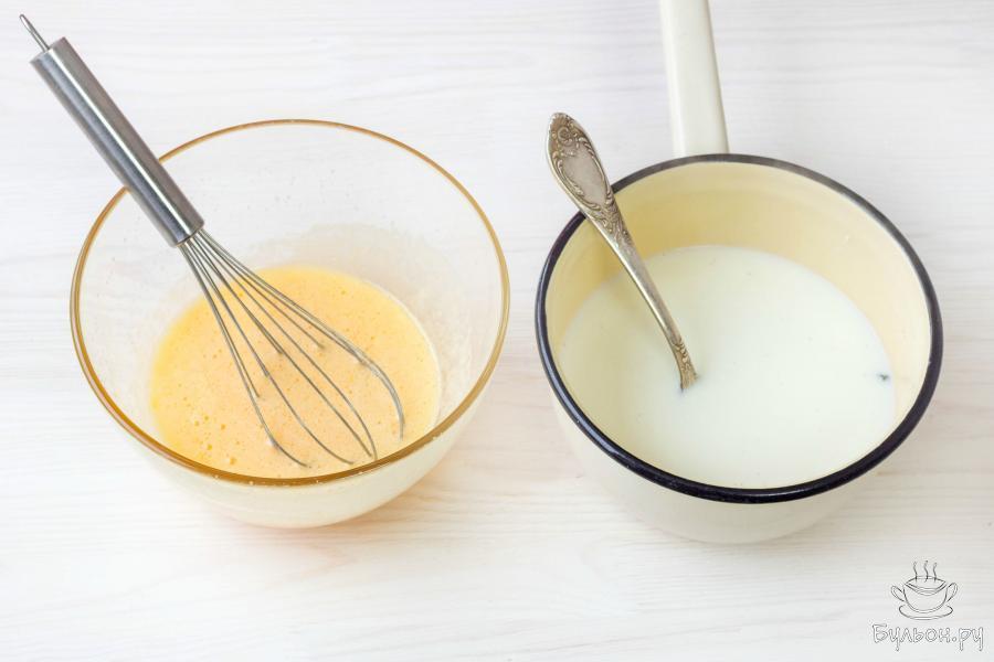 6. Помешивая яичную смесь, небольшими порциями влейте горячее молоко. Если влить сразу все горячее молоко - белок свернется под воздействием температуры и у десерта появиться выраженный яичный вкус, напоминающий омлет.
