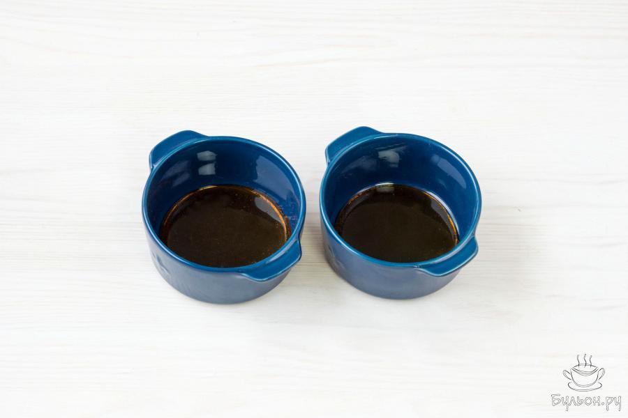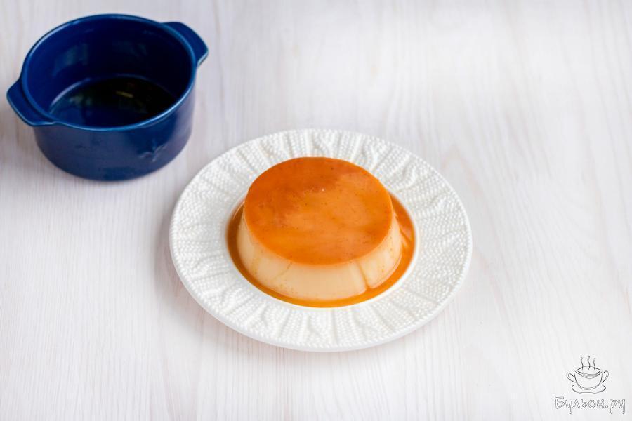 2. Разлейте карамель по порционным формам, так чтобы она покрывала дно каждой формы тонким слоем. Оставьте карамель на 10-15 минут при комнатной температуре, для того чтобы она охладилась и застыла.