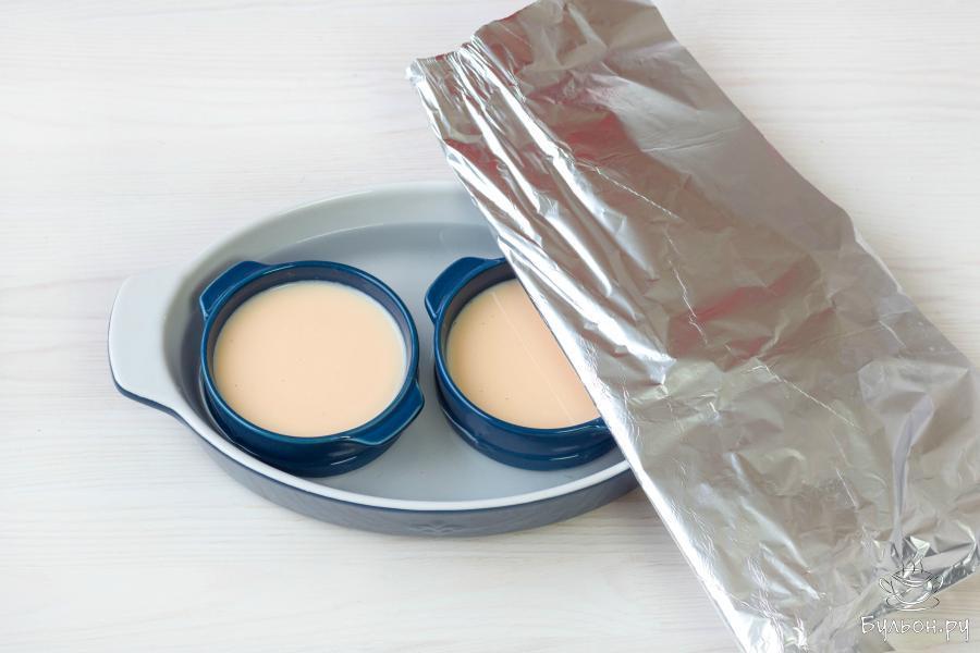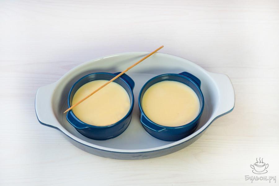 8. Поместите подготовленные формы с десертом в глубокую емкость. Заполните емкость теплой водой, так чтобы формочки с десертом были погружены в воду на две трети.