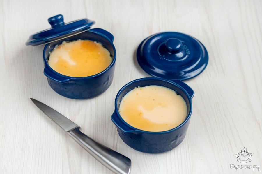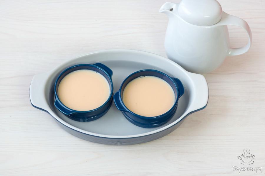 7. Получившуюся яично - молочную смесь процедите и разлейте по порционным формам для запекания. Процеживание смеси позволит удалить крупные пузырьки воздуха и сделать текстуру готового десерта гладкой и однородной.