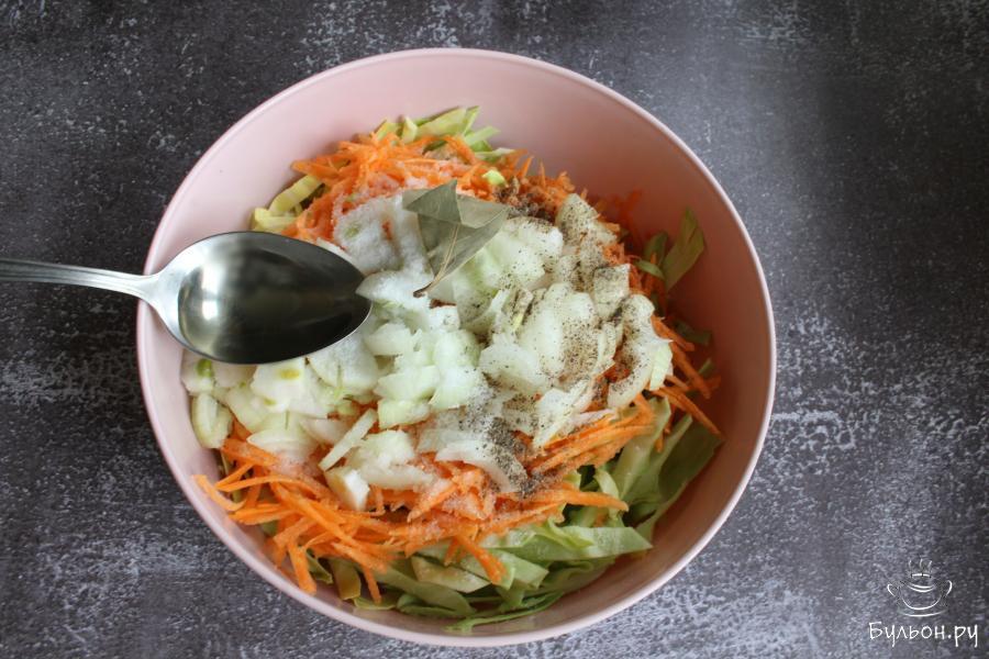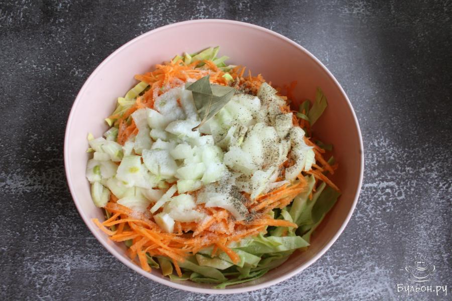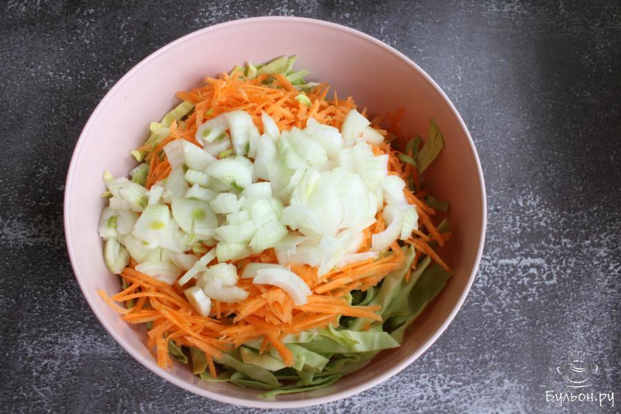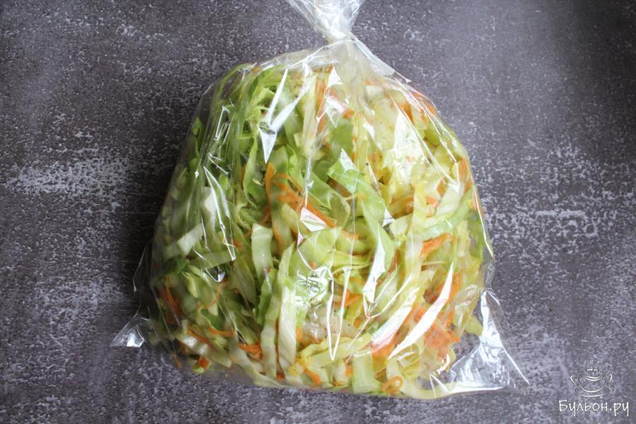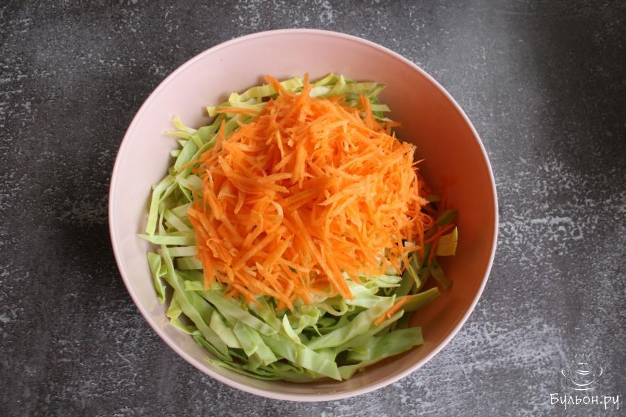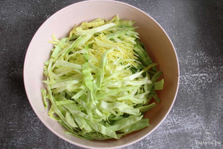 1. Нашинковать капусту. Если капуста молодая, то шинковать не очень тонко, зимнюю капусту нужно шинковать потоньше.