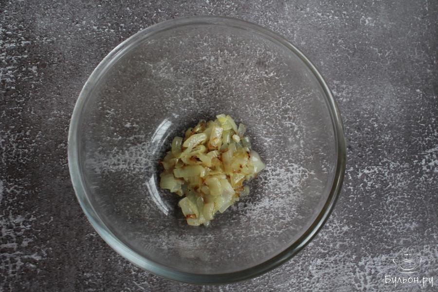 6. Репчатый лук мелко нарезать и обжарить до мягкости на 1-2 ч. л. разогретого растительного масла. Выложить лук в чашку.