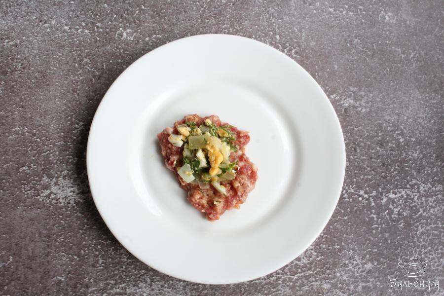 9. Кусочек фарша выложить в виде лепешечки на тарелку, на фарш выложить около 1 ч. л. начинки и сформировать котлету.