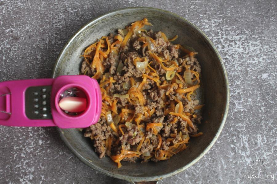 3. Морковь почистить, промыть и перетереть на крупной терке. Добавить морковь к луку, жарить 5 минут.