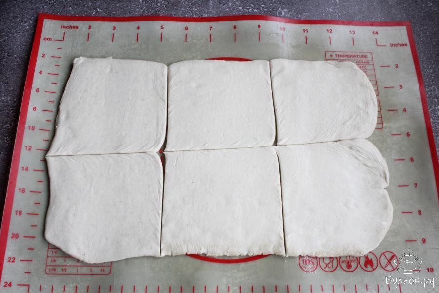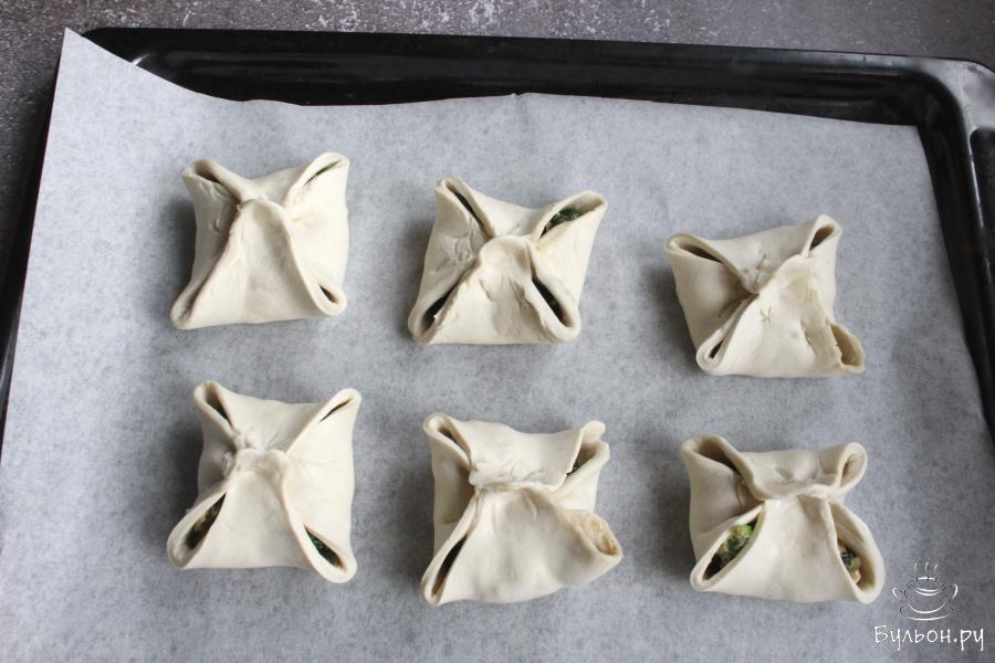 6. Разделить начинку на тесто. Концы квадратов собрать сверху, сильно скреплять тесто не нужно. Выложить слойки на противень.