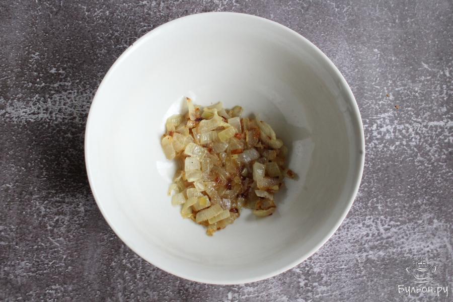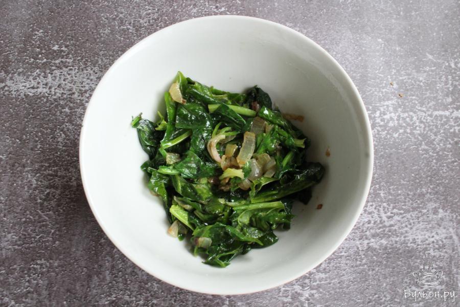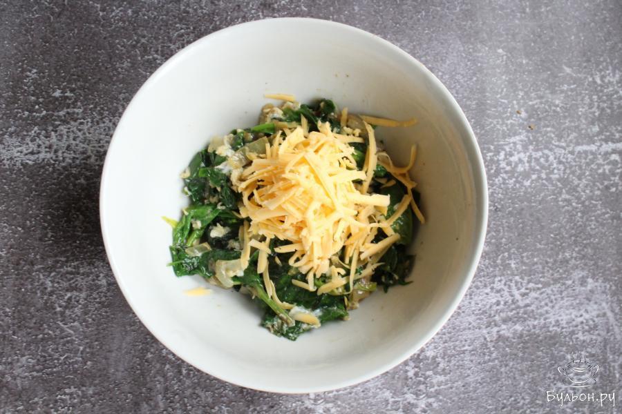 4. Добавить в начинку тертый сыр, прогреть пару минут, чтобы он расплавился. Посолить и поперчить начинку по вкусу.