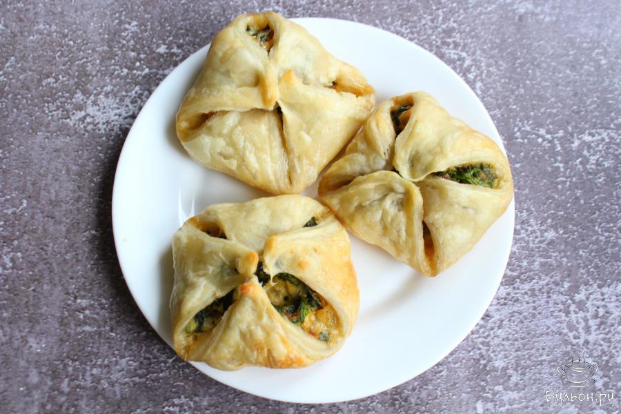 Слойки с начинкой из шпината, сыра и яиц - это быстрая весенняя выпечка, которая порадует вас своим вкусом. Рецепт выручит вас когда нужно что-то срочно испечь, буквально за полчаса у вас будет горка крупных сытных слоек. Слойки получаются мягкие, но аппетитно хрустящие, а начинка сырная и очень вкусная. Начинку можно дополнить любой другой любимой зеленью, добавить в начинку пряности, это по вашему вкусу. Тесто для приготовления нужно бездрожжевое слоеное.